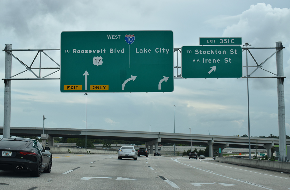 Interstate 10 stays through rural areas of Northern Florida, meeting I-75 outside Lake City and crossing a wide swath of Osceola National Forest toward Jacksonville. Continuing into Jacksonville, Florida’s largest city, I-10 expands into a six and eight lane urban freeway, concluding at I-95 between Downtown and the Fuller Warren Bridge spanning the St. Johns River.