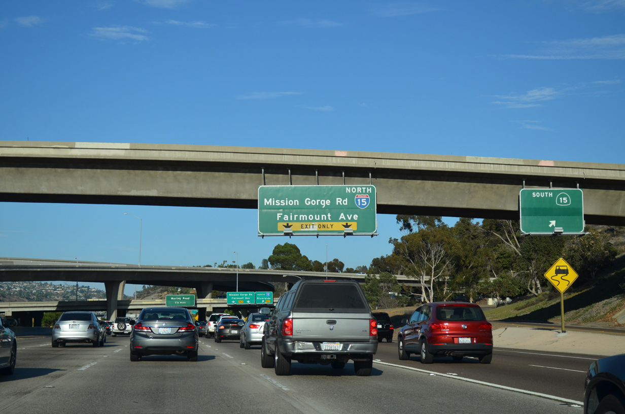 Button copy guide signs along California State Route 15 north leading to the exchange with I-8 and I-15 were replaced as a result of 2015-17 construction to add bus lanes along the freeway median. 07/28/14