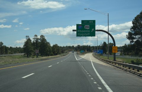 Interstate 17 between Phoenix and Cordes Junction (Exit 262), replaced the southern extent of State Route 69. This is significant because the exit numbering scheme still follows the original mileage of SR 69. According to the Misc.Transport.Road FAQ (Marc Fannin) and based on comments from Richard C. Moeur, a unique milepost system was utilized in Arizona until the mid-1980s. The system specified that any route that did not enter Arizona from another state used the mileage of the intersecting route’s mileage at its south or west end as its starting value. The former route of SR 69 originated from U.S. 89 at milepost 201. Since I-17 and SR 69 overlapped originally, the exit numbers along the freeway used the mileposts of SR 69.
