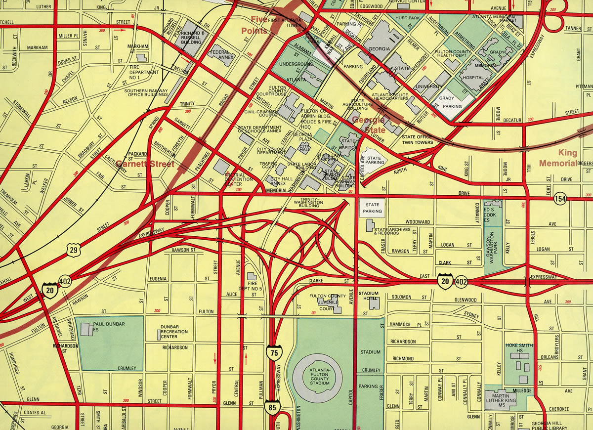 The original configuration of the Capitol Hill Interchange joining I-20 with I-75/85 (Downtown Connector) in Atlanta utilized a number of left exit ramps. This exchange was redesigned into a three-level interchange as part of the “Freeing the Freeways” megaproject between 1985 and November 1988.