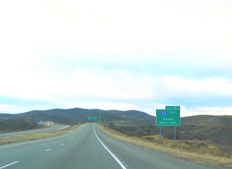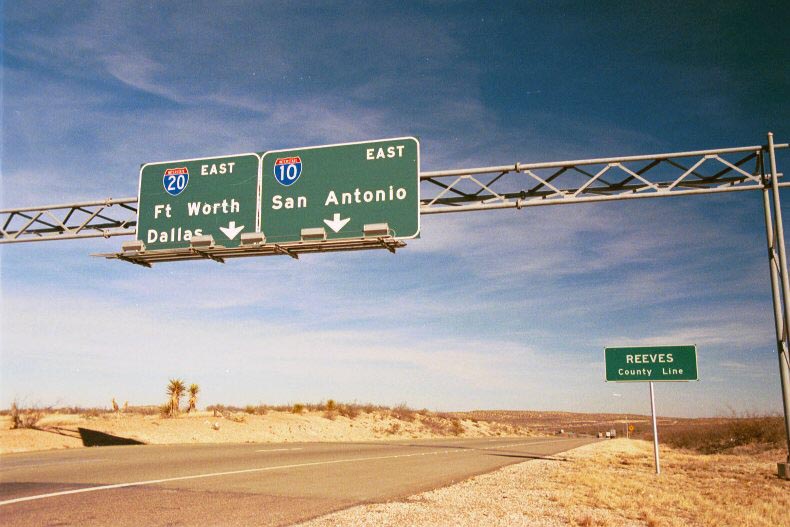 Previous guide signs for IH 20 east from IH 10 west referenced Pecos in place of Dallas. Photos by Steve Hanudel (01/11/05).