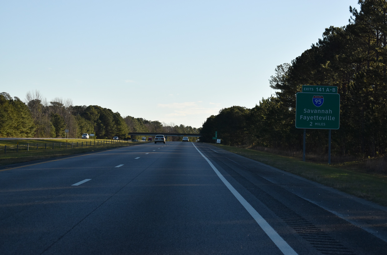 26 miles east of Interstate 285 at Covington, I-20 reduces from six to four lanes as it departs the Atlanta metropolitan area. The ensuing 150 miles to Augusta takes I-20 across vast areas of pine forest. Suburbia appears along the freeway frontage from Exit 190 eastward to North Augusta, South Carolina. Interstate 520 (Bobby Jones Expressway), a freeway loop around the west and south side of Augusta, ties into this stretch of I-20. I-520 ended ahead of the Savannah River until 2004, when the first of two extensions lengthened the route into South Carolina. The Palmetto Parkway section of I-520 in North Augusta was completed to I-20 at Exit 6 on December 16, 2009.