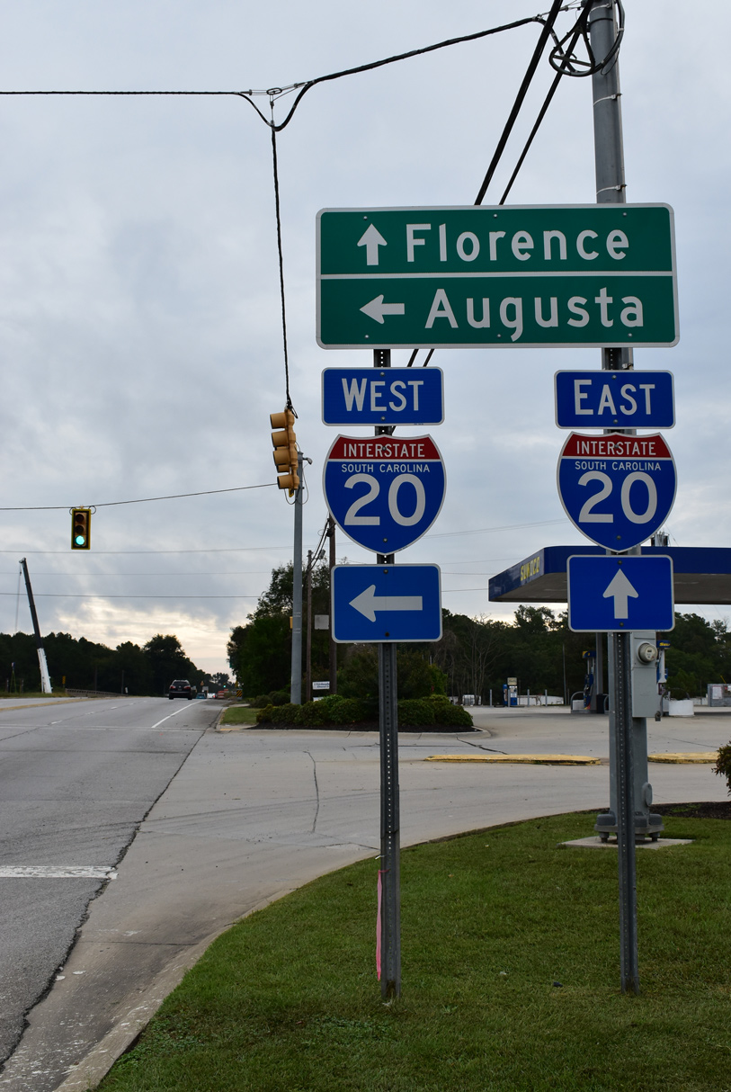 Leaving central South Carolina, the final 60 miles of Interstate 20 to Florence traverse a mixture of pine forest, agricultural areas and wetlands. The freeway avoids the main population centers along this stretch, and lower traffic counts reflect this. The freeway concludes at I-95 and Business Spur I-20 east. The city of Florence spreads to the east of I-95, with two shopping malls and other assorted retail lining Business Spur I-20 (David H. McLeod Boulevard) to U.S. 76.