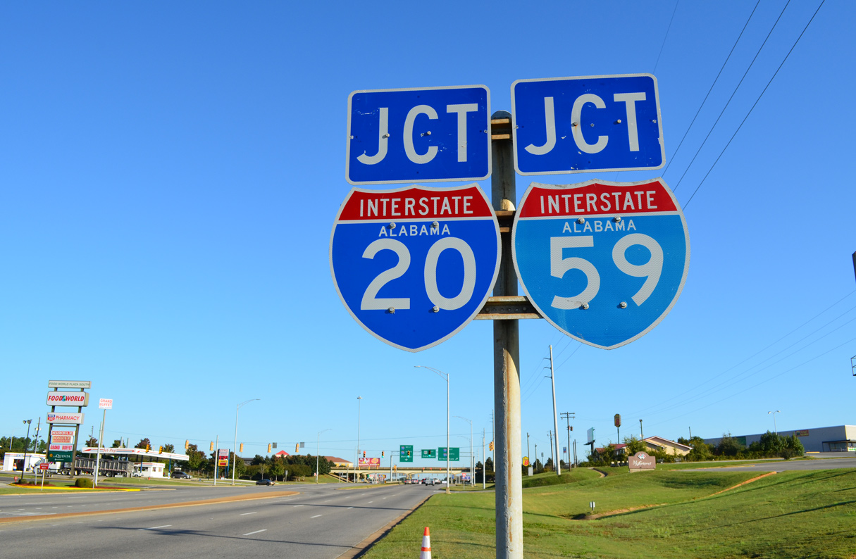 Continuing northeast toward Birmingham, Alabama’s largest city, I-59/20 maintain six lanes with increasing traffic counts. Interstate 459 provides a bypass for through traffic around Birmingham and Jefferson County for points north and east. While the southwest suburb of Bessemer is more industrial based, Hoover, Vestavia Hills and other suburbs south of Birmingham and within Shelby County add substantial commuter traffic to I-459. Staying north to Downtown Birmingham, I-59/20 proceed to Interstate 65 and the locally named “Malfunction Junction”. The exchange with I-65 utilizes left side ramps, with roadways along both freeways switching sides.