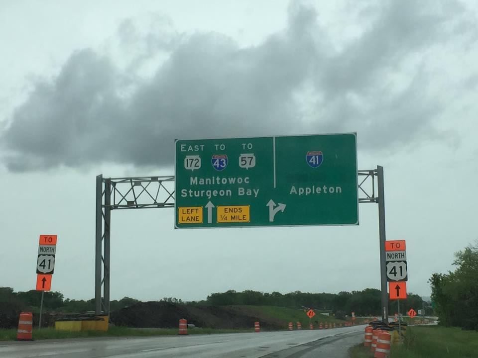 Interstate 41 replaced U.S. 41 along the freeway corridor between Milwaukee and Green Bay via Fond du Lac and Appleton. This included the U.S. 41 overlap with I-894 and along I-94 southward from Milwaukee to Russell Road (Exit 1 A) and the Illinois state line. Resigning of U.S. 41 to Interstate 41 through Wisconsin took place between late May and November 2015. The $5.9 million project included the posting of 3,200 signs over the 180 mile long route.1