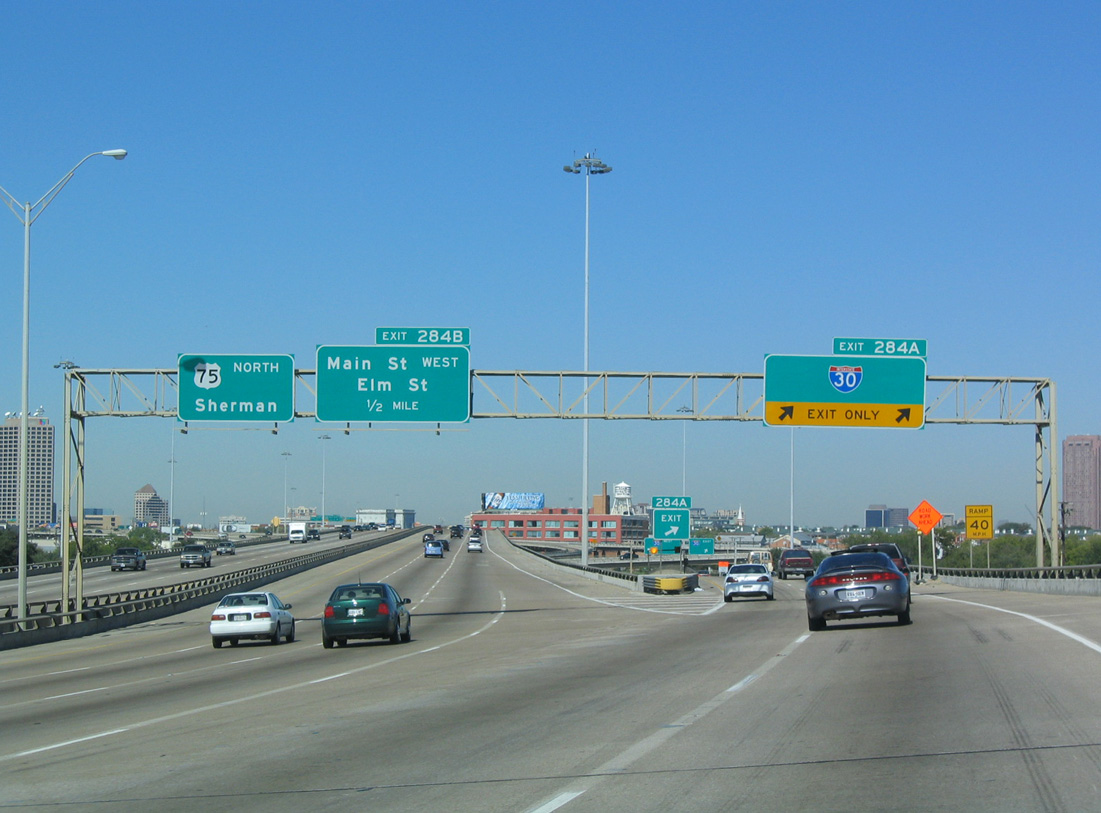 IH 45 concludes at IH 30 and U.S. 75 (Central Expressway) by Deep Ellum and Downtown Dallas. The southern 1.427 miles of U.S. 75 double as unsigned IH 345. Exit numbers continue northward along the IH 345 segment to Spur 366 (Woodall Rogers Freeway), where they reset using a sequential system along the remainder of U.S. 75 northward.