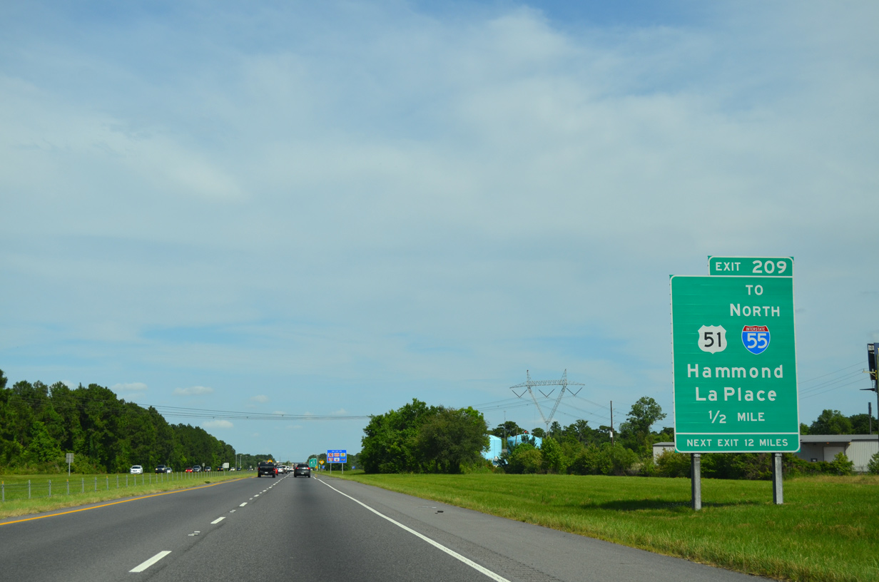 Interstate 55 parallels the Mississippi River for much of its length. The route originates at Interstate 10 outside the city of La Place, located west of New Orleans in the Delta region. The freeway runs northward along an isthmus between Lakes Maurepas and Pontchartrain between LaPlace and Ponchatola. This section of Interstate 55 is elevated. Beyond I-12 at Hammond, I-55 traverses timberland en route to McComb and Brookhaven in southern Mississippi.