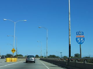 The end shield for I-55 at the gore point separating traffic was installed by 2017. Lake Shore Drive was once proposed as part of an Interstate 494 downtown loop. The highway never came to fruition as it would have involved serious alteration of the Lake Michigan waterfront. Photo by Peter Johnson (01/18/21).