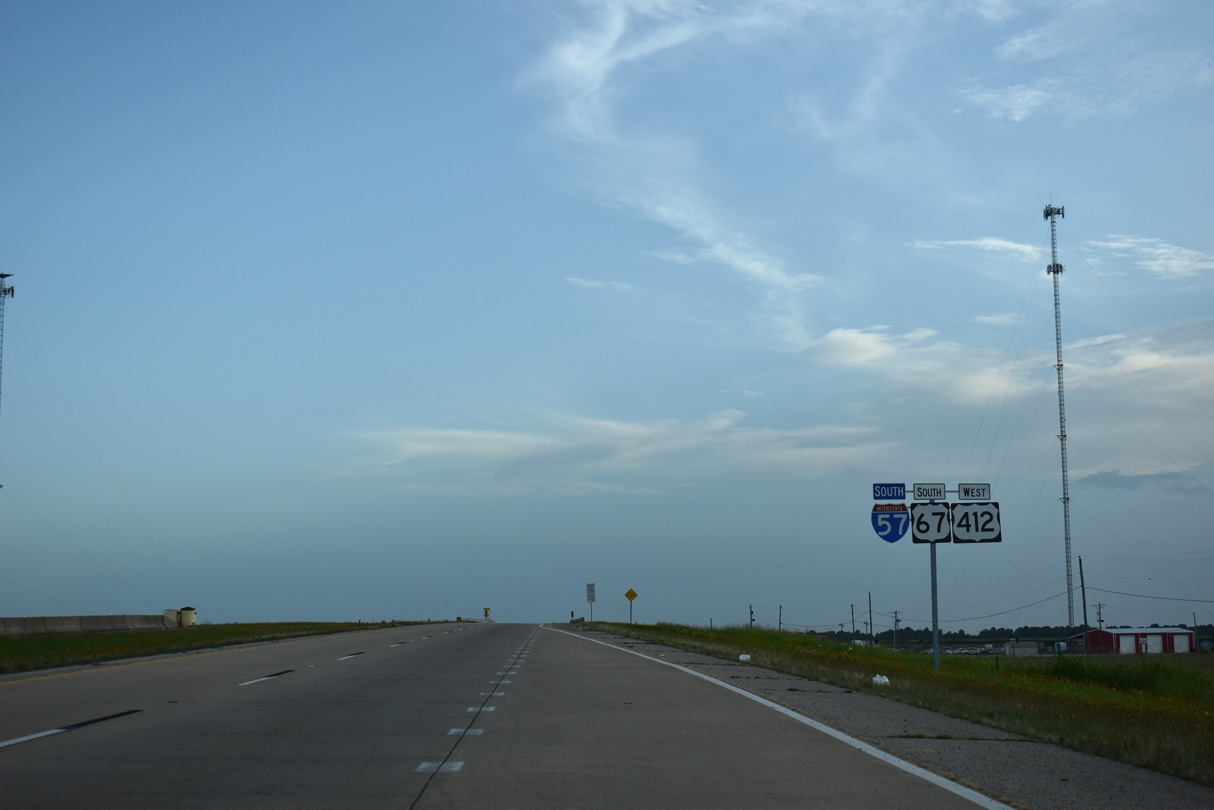 The first of three Future I-57 signs posted along U.S. 67 southbound in Arkansas appeared just after the northernmost interchange with U.S. 412 in Walnut Ridge. 09/09/20