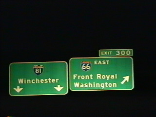 An older guide sign again for I-81 north at Exit 300 for I-66 east. The 6.6-mile stretch of Interstate 66 east from here to U.S. 340/522 opened in October 1971.3 05/27/95
