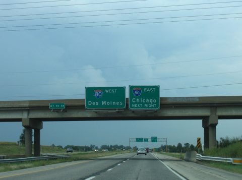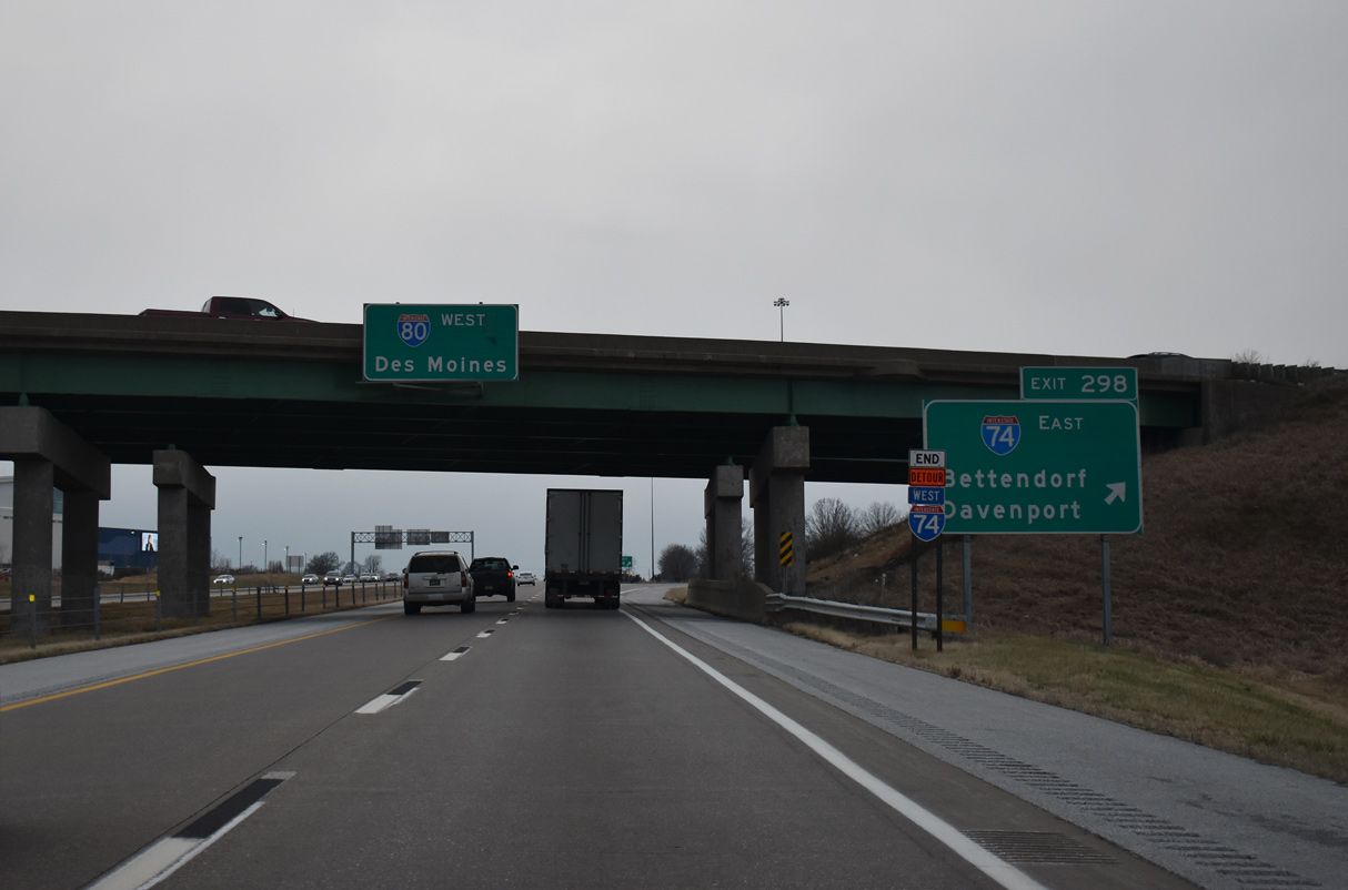 The mainline of I-74 defaults onto I-80 west ahead of the cloverleaf interchange with U.S. 61 north and U.S. 61 Business (Brady Street) south. U.S. 61 links the Quad Cities with Dubuque while I-80 constitutes a heavily traveled freight corridor across the Hawkeye State to Iowa City, Des Moines and Council Bluffs. 06/21/22