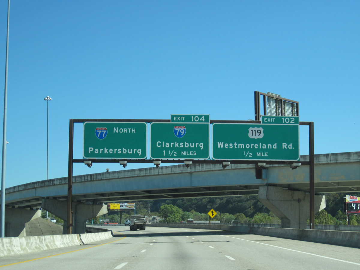 Interstate 79 largely follows U.S. 19 from Sutton, West Virginia north to Erie, Pennsylvania. The westward leg between Sutton and Charleston partially lines U.S. 119 from Clendenin to I-77 at Charleston. U.S. 119 also intermingles with the I-79 corridor through Morgantown.