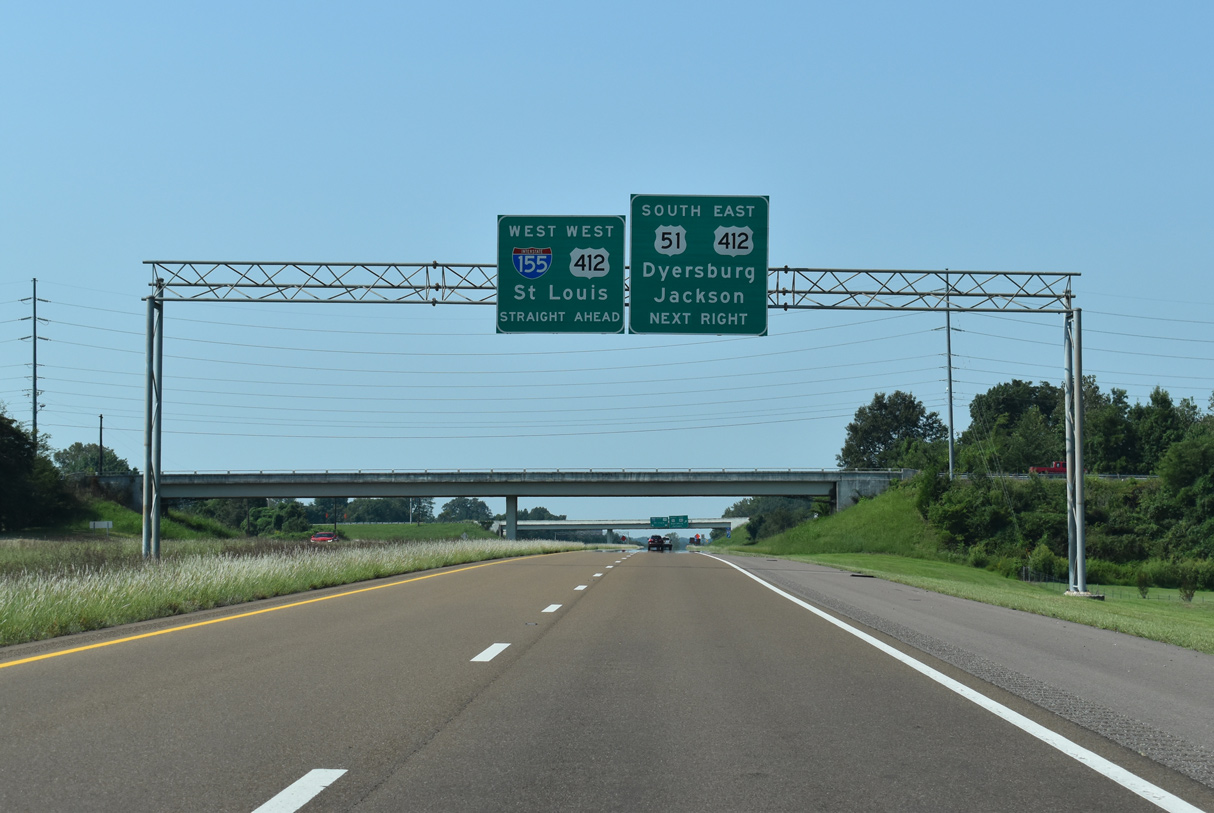 Single lane ramps separate for U.S. 51 north to Troy and Union City and I-155/U.S. 412 west to Caruthersville and Hayti, Missouri. 09/09/20