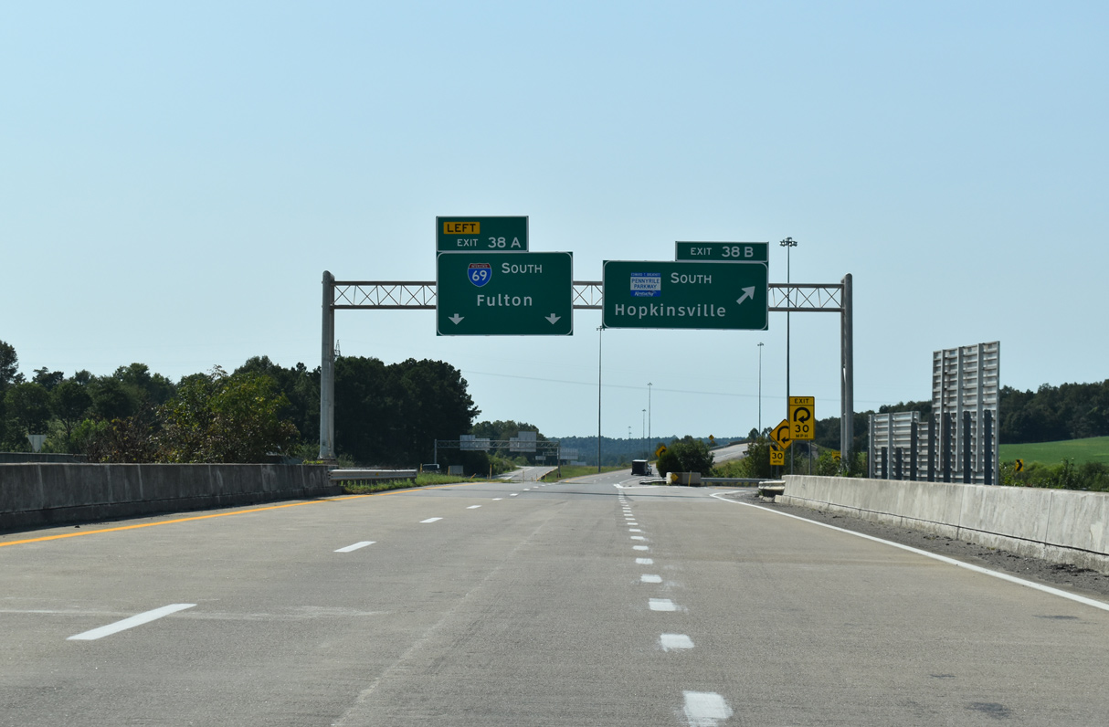 Interstate 69 heads south from the city of Mortons Gap to a systems exchange with I-169 (Edward T. Breathitt Pennyrile Parkway) and Western Kentucky Parkway (Future I-569) northeast of Nortonville. 06/25/22
