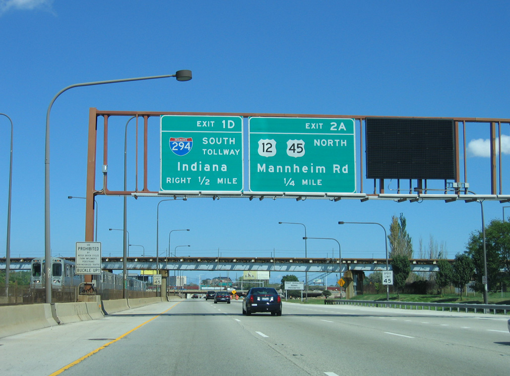The U.S. Route 12/45 Mannheim Road Project underway between Spring 2013 and Fall 2015 reconfigured the cloverleaf interchange joining Interstate 190 with the arterial route. Split into two contracts, work widened 3.2 miles of U.S. 12/45 to six overall lanes north of IL 19 (Irving Park Road) to IL 72 (Higgins Road). The $59.6 million project removed both eastbound ramps from I-190 to Mannheim Road. The connection to U.S. 12/45 was shifted onto O’Hare Road east from Bessie Coleman Road to the entrance ramps near Balmoral Avenue.