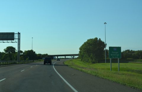 Sign changes made along I-194 north by 2011 replaced the local control cities of Bismarck and Mandan with Fargo and Billings. Photo by Jeff and David Morrison (05/11/07).