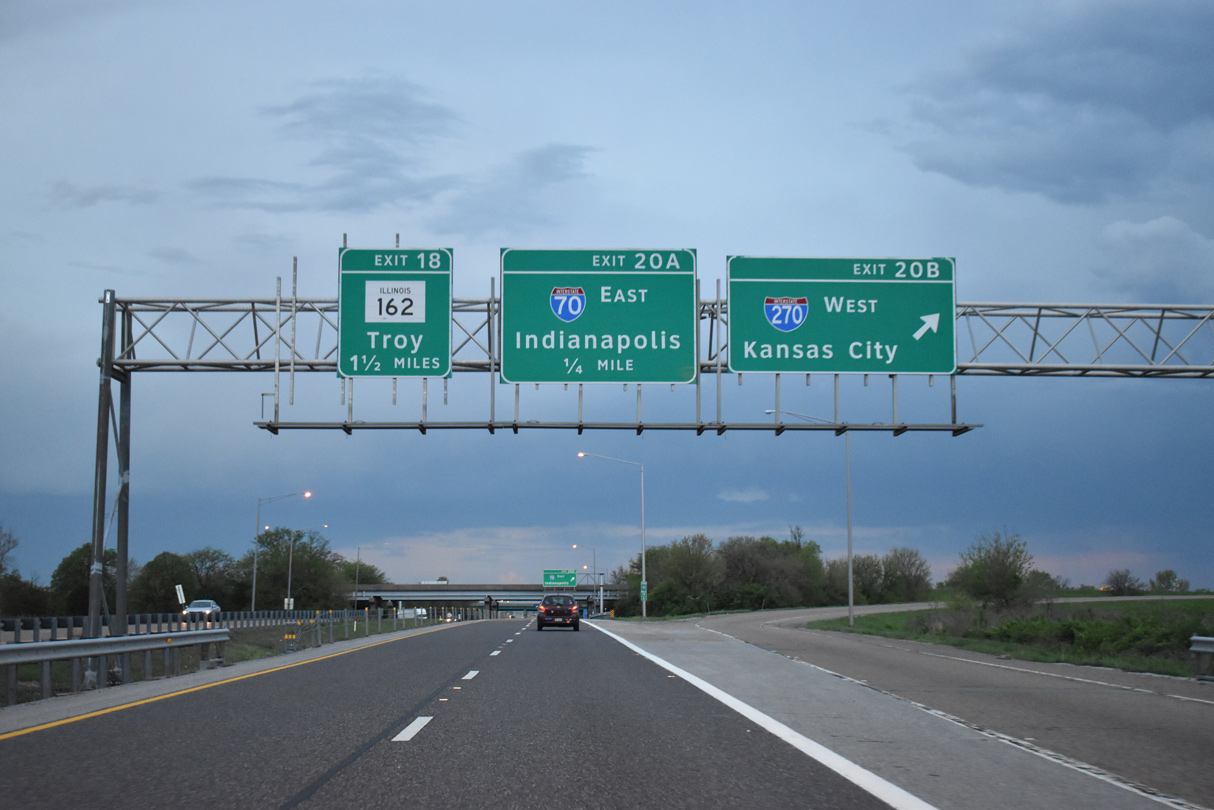 Mile posts along Interstate 270 increase from zero at I-55 and I-255 in south St. Louis County to 34 at the Mississippi River. Illinois restarts the count at zero at the Missouri state line and continues to 15 at I-55/70. Despite Interstate 70 meeting the east end of I-270 at around milepost 19, the numbering sequence from I-270 extends east along I-70.