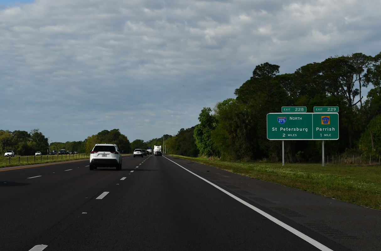 Interstate 275 heads one mile west from Exit 228 to U.S. 41 at Rubonia. U.S. 19 north overlaps with I-275 from Terra Cela to 54th Avenue S / Exit 17 in south St. Petersburg. 03/06/24