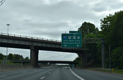 Interstate 277 encircles the central business district of Charlotte to the east of I-77 and U.S. 21. The north end connects with NC 16 (Brookshire Freeway) leading northwest toward I-85. U.S. 74 overlaps with I-277 along the John Belk Freeway from Wilkinson Boulevard to an expressway along Independence Boulevard east.