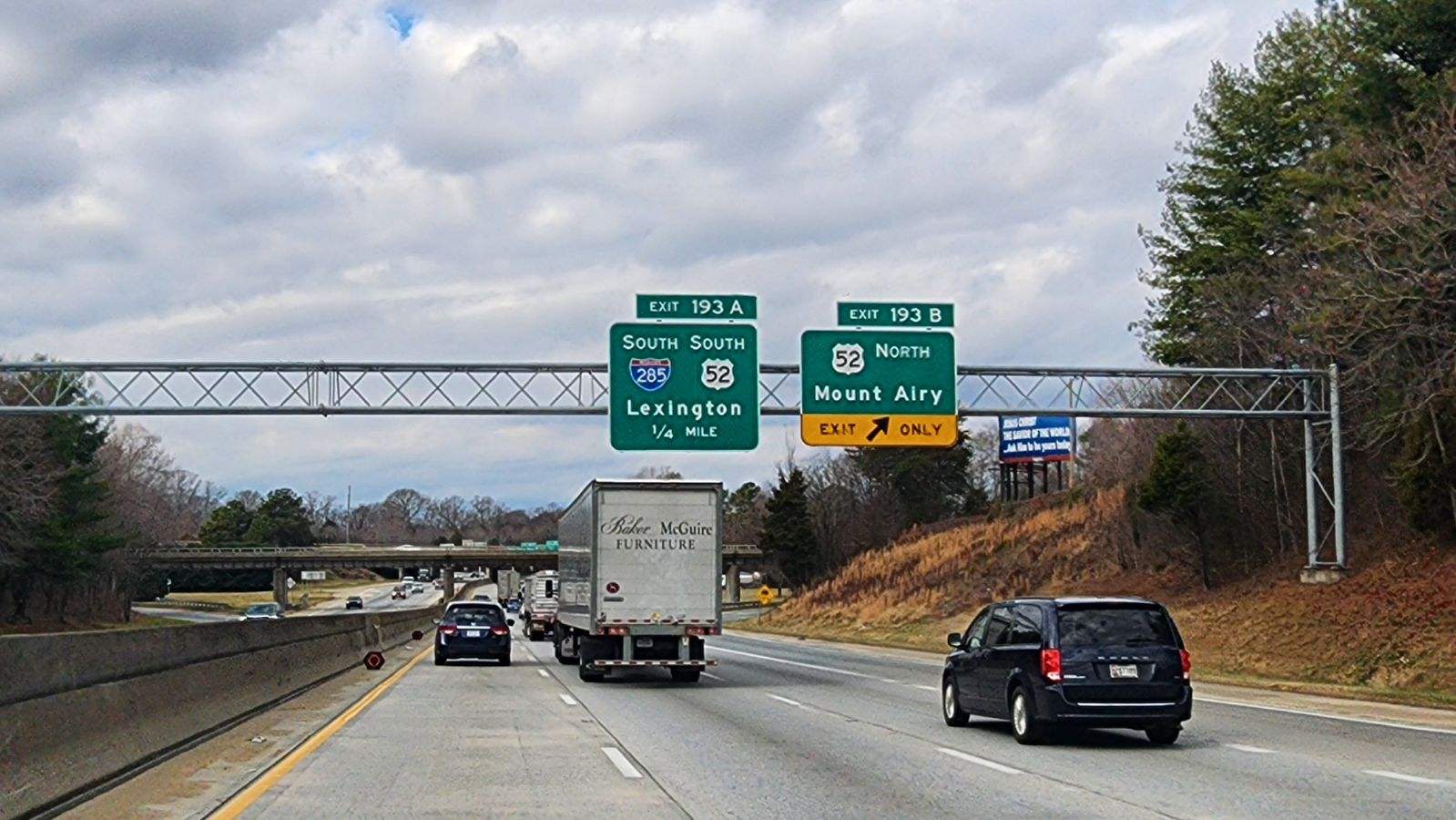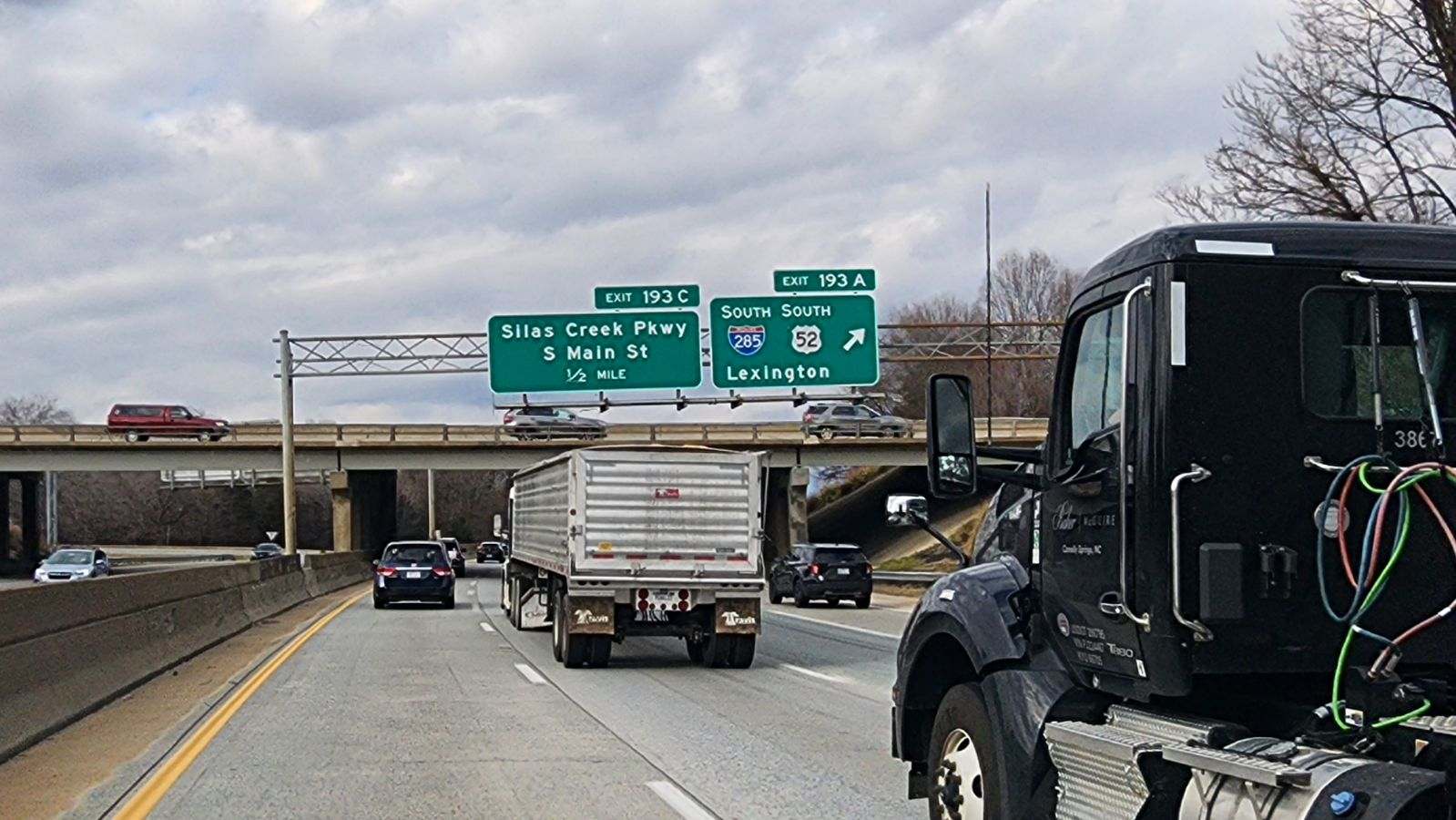Beginning at the split of U.S. 29-52-70 and from Interstate 85 at Exit 87 near Davidson County Airport (EXX), I-285 initially travels northeast toward Lexington. Business Loop I-85 and U.S. 29/70 depart for Downtown while I-285 and U.S. 52 continue around Lexington, bypassing it to the west. The freeway proceeds north around both Welcome and Midway before entering Forsyth County. I-285 concludes at the exchange with I-40 while the freeway along U.S. 52/NC 8 continues into Winston-Salem.