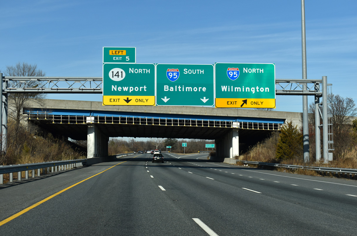 Work between February 2016 and Spring 2019 reconstructed I-295 southbound from the Farnhurst Interchange with U.S. 13/40 to I-95/495. All guide signs were replaced during this project. 10/03/14
