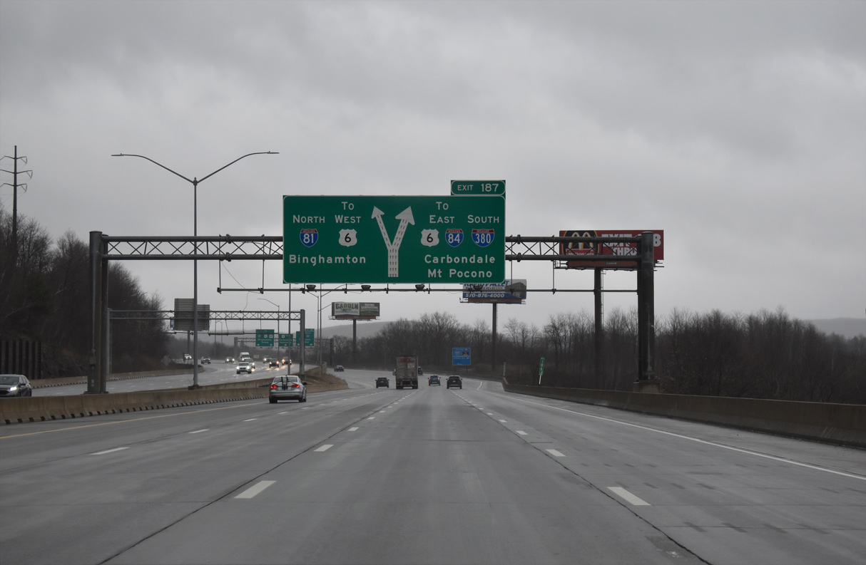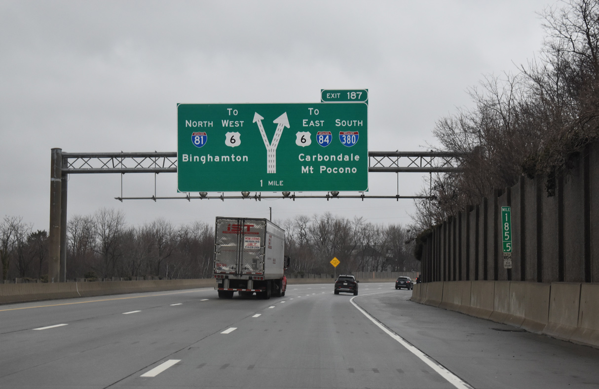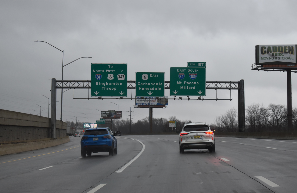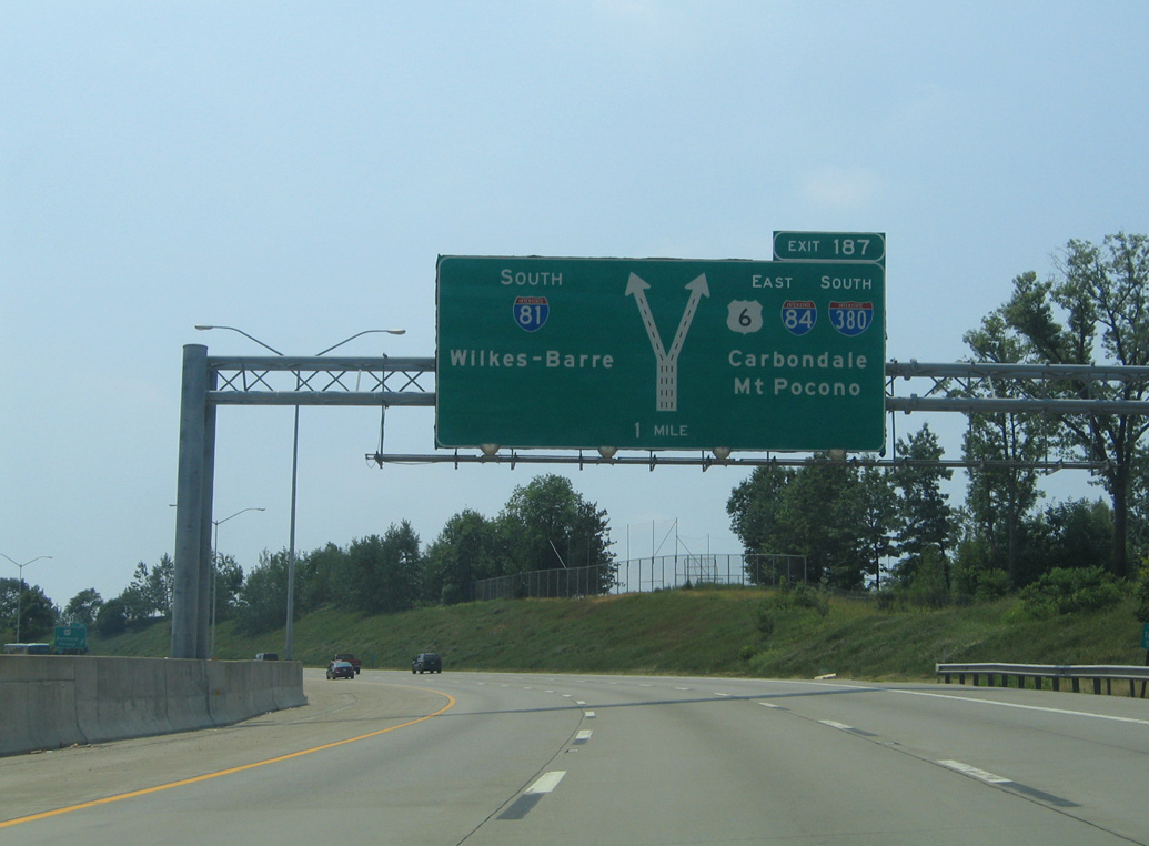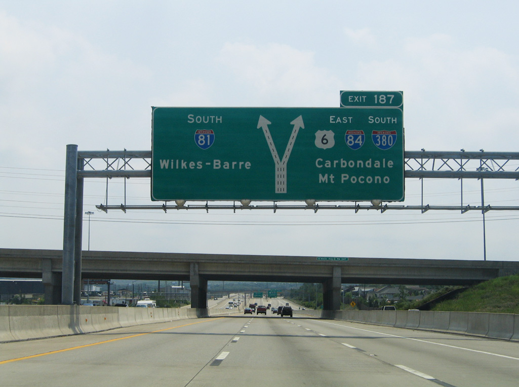 Exit 187 shifts motorists onto a collector distributor roadway leading southeast from PA 347 to I-84 east, I-380 south and U.S. 6 east. I-84 connects Scranton with Hartford, Connecticut and Boston, Massachusetts while I-380 south to I-80 east leads toward New York City. Photo by Chris Elbert (07/06).