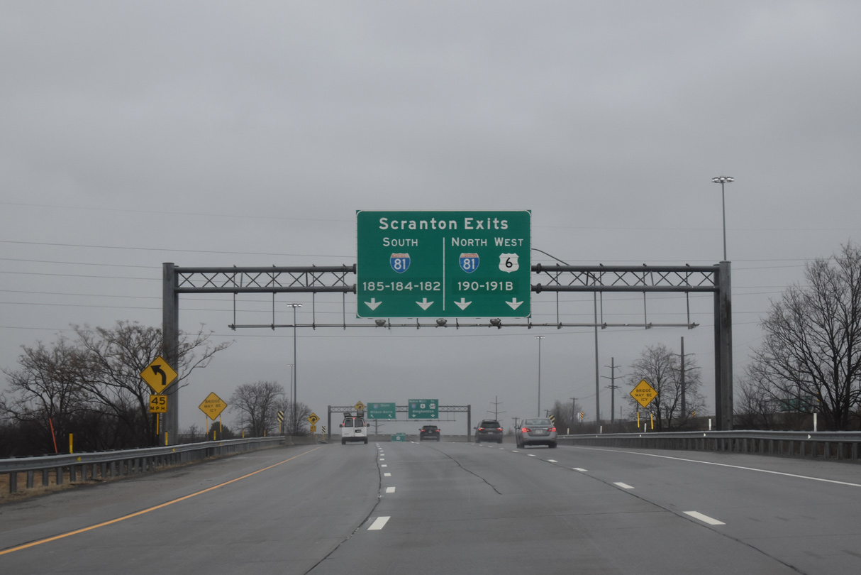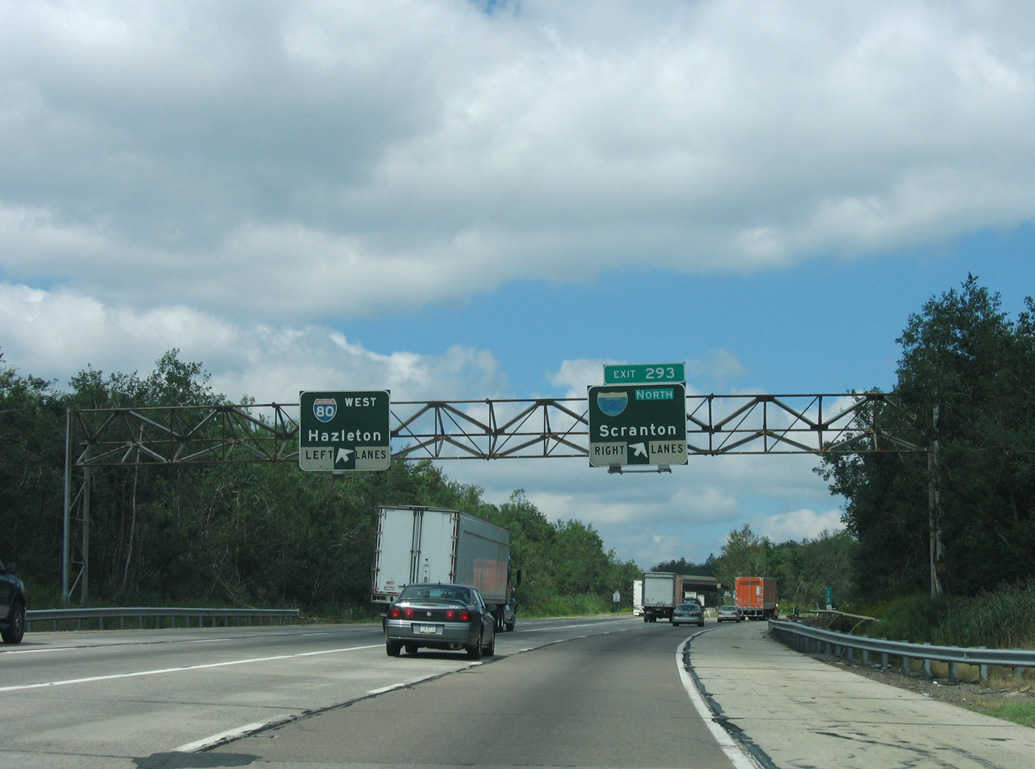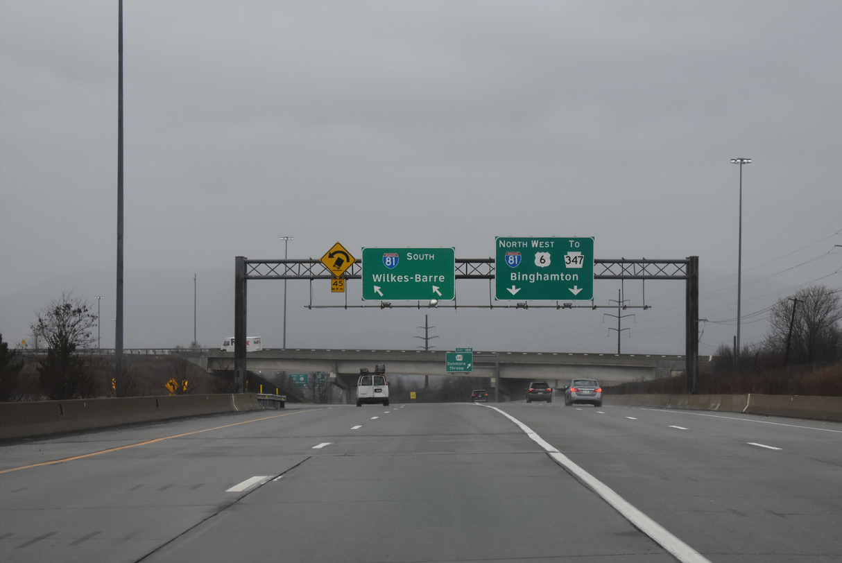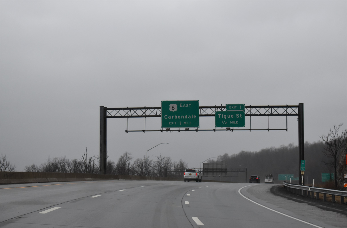Exit 187 shifts motorists onto a collector distributor roadway leading southeast from PA 347 to I-84 east, I-380 south and U.S. 6 east. I-84 connects Scranton with Hartford, Connecticut and Boston, Massachusetts while I-380 south to I-80 east leads toward New York City. Photo by Chris Elbert (07/06).