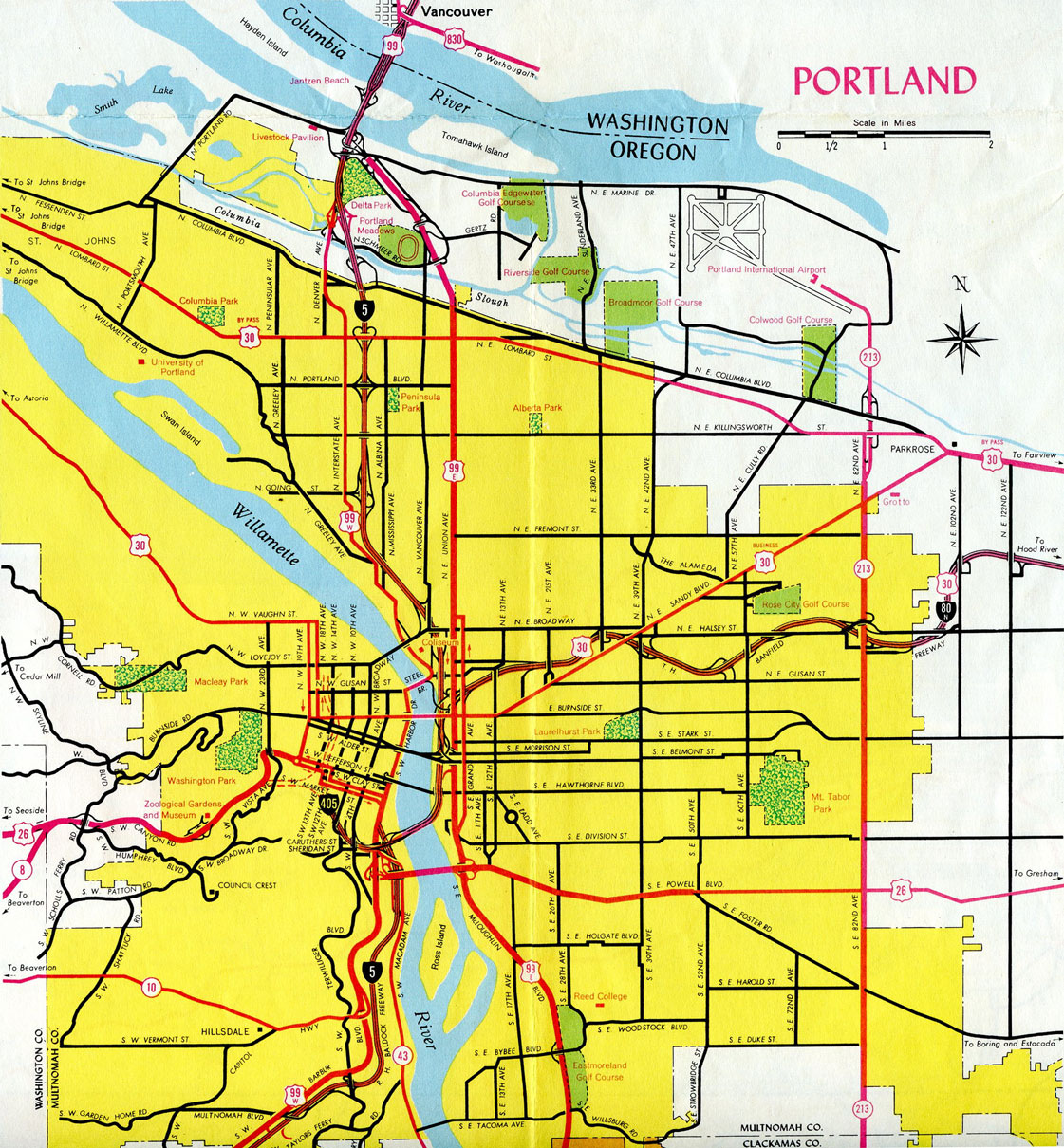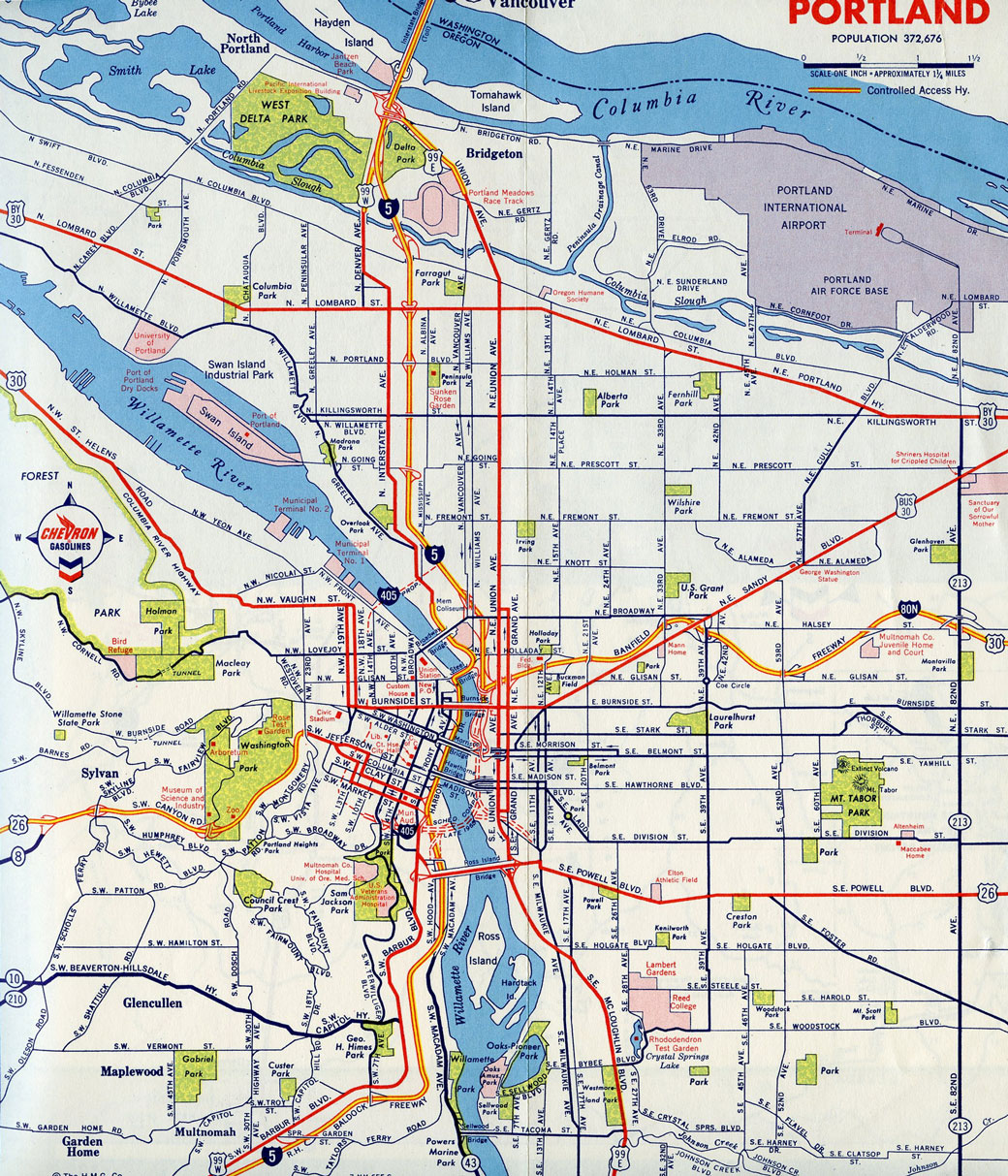 1965 Gousha map showing Interstate 405 under construction south of the Portland city center.