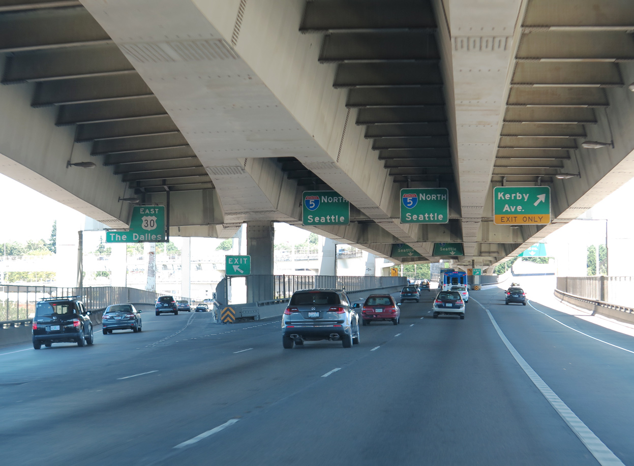 The Stadium Freeway, Interstate 405 is a short urban loop encircling Downtown and the Pearl District in Porland west of the Willamette River. I-405 overlaps with U.S. 30 across the Fremont Bridge to I-5 at the Boise and Eliot neighborhoods. The south end of the freeway ties into the Marquam Bridge taking Interstate 5 northeast from the South Waterfront area to East Portland.