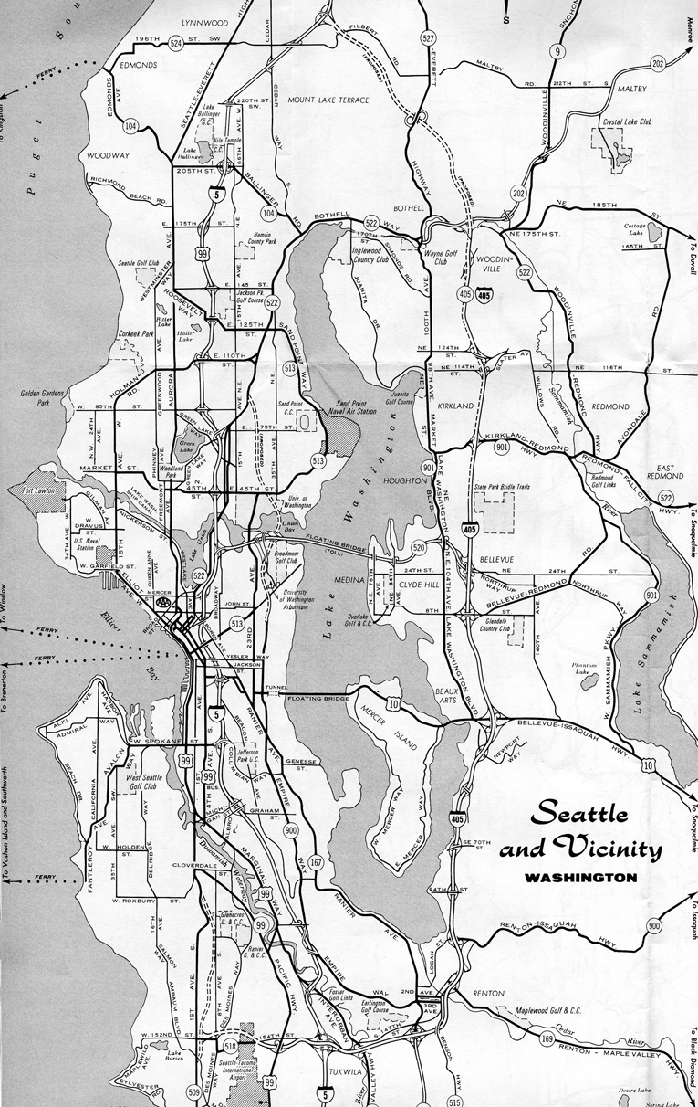 Interstate 405 completed north to Bellevue on the 1967 Official Washington Highway Map