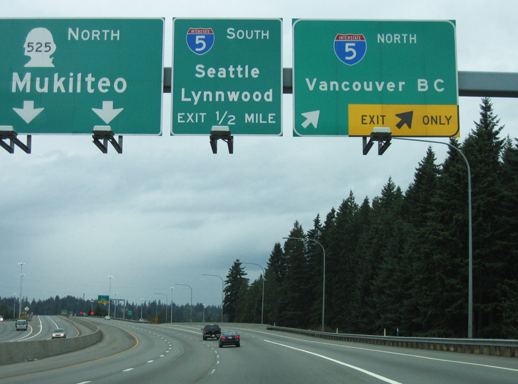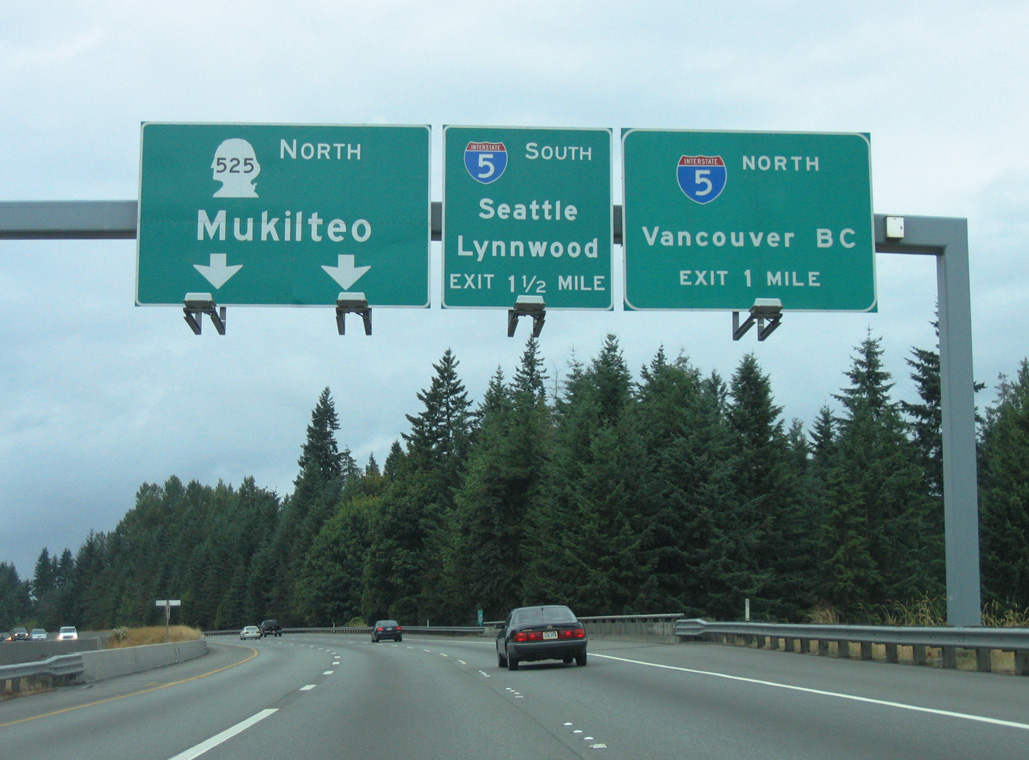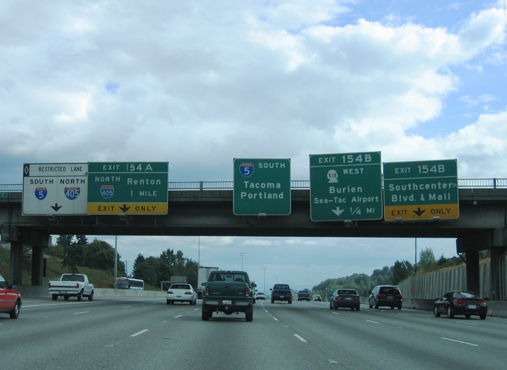 State named trailblazers for I-5 and I-405 along the eastbound entrance ramp to SR 518 from Seattle-Tacoma International Airport (SEA). Photo by Jeff Royston (02/24/06).