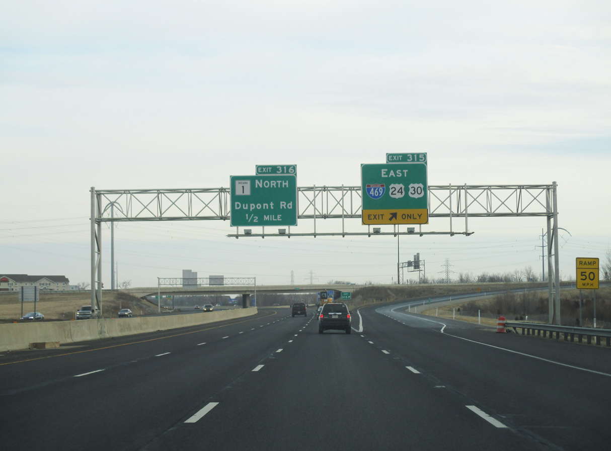 Similar to other urban centers across Indiana, the Fort Wayne bypass carries other signed routes away from the city. U.S. 24 accompanies I-469 to the north from I-69 at Exit 31 to Exit 21. U.S. 30 also overlaps with I-469 along this stretch, continuing south to Exit 19. U.S. 33 runs alongside I-469 from I-69 at Exit 0 to Exit 11.
