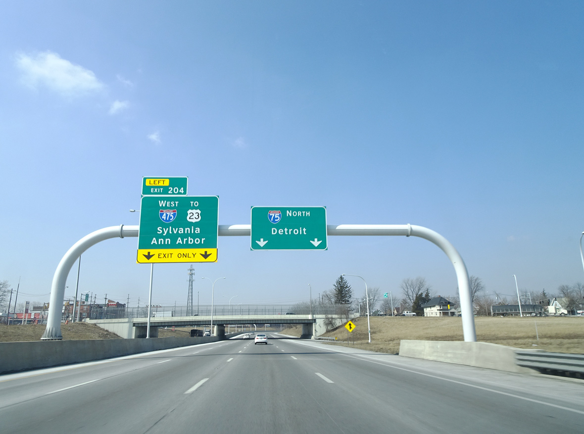 Interstate 475 is a bypass and commuter route in the Toledo metropolitan area. Looping west from I-75 at Perrysburg, the freeway crosses the Maumee River into the city of Maumee. Proceeding north. I-475 heads through Holland along the west side of Toledo to connect directly with the U.S. 23 freeway to Ann Arbor, Michigan near Sylvania. The remainder of I-475 travels east back to I-75 near Downtown Toledo.