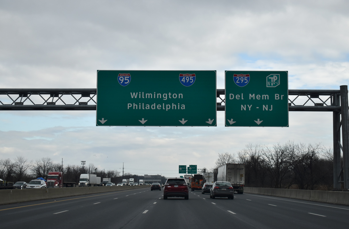 I-95 continues south into Wilmington, DE while I-495 bypasses the city to the east.