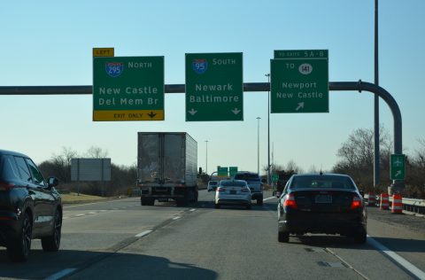 Traffic separates for I-95 south toward Newark and the left exit ramp for I-295 northbound toward New Castle and the Delaware Memorial Bridge. 12/20/22
