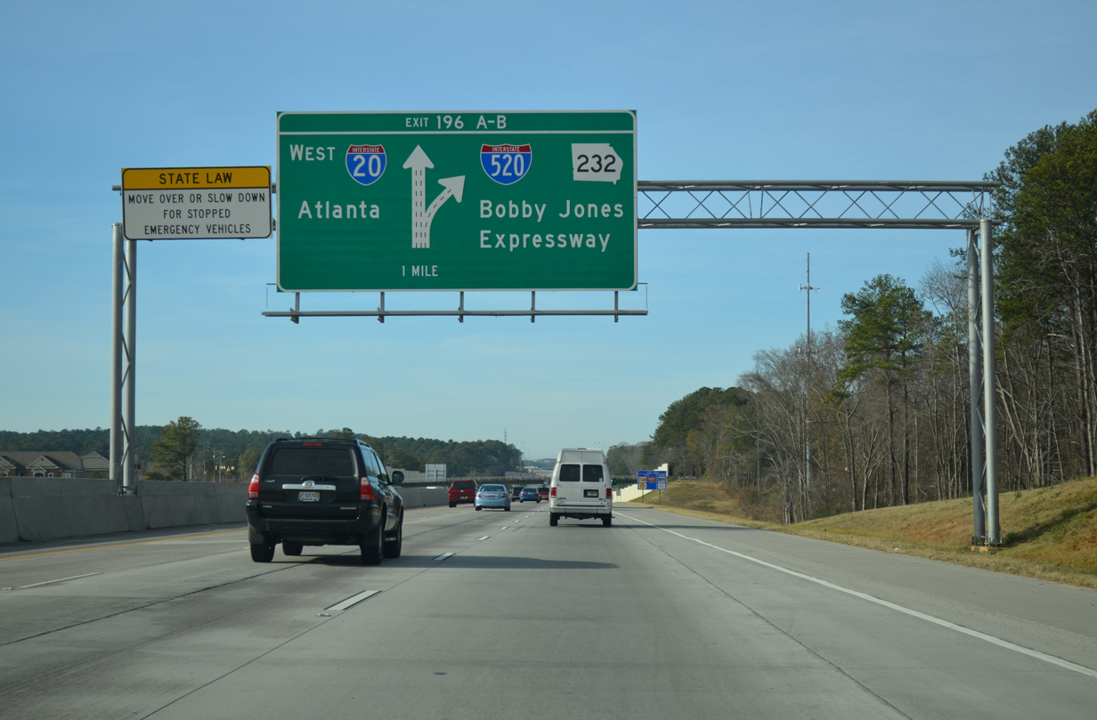 Further expansion of Interstate 520 took place between March 2012 and January 2015. Costing $33 million, work added a lane in each direction between U.S. 78/278 (Gordon Highway) and U.S. 1 (Deans Bridge Road) while also removing loop ramps at the respective cloverleaf interchanges.11