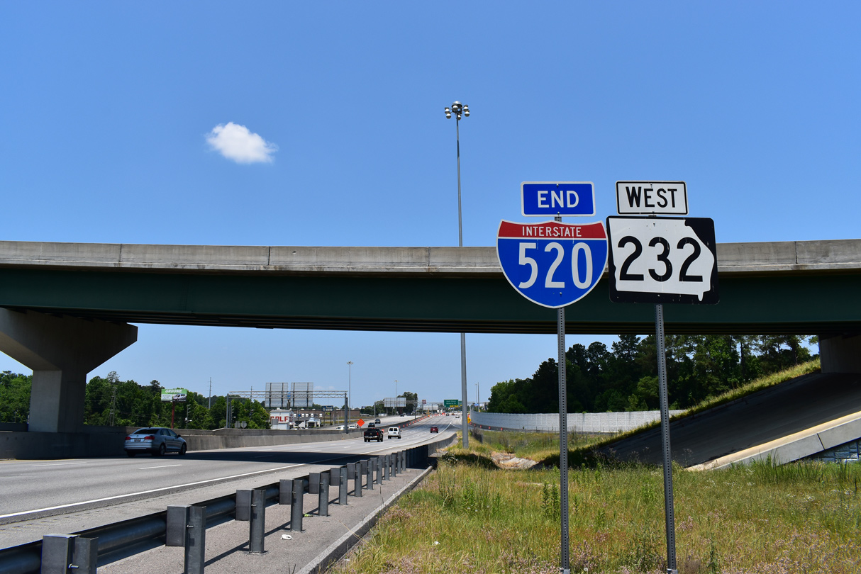 Known as the Bobby Jones Expressway in Georgia and Palmetto Parkway in South Carolina, Interstate 520 encircles Augusta and North Augusta along a 23-mile loop. Running south from SR 232 and I-20 to Wrightboro Road (Exit 2), the freeway starts out with eight overall lanes separated by a concrete barrier median. Serving a bevy of retail areas and Augusta Mall, this stretch includes a pair of two-lane collector distributor roadways as it .