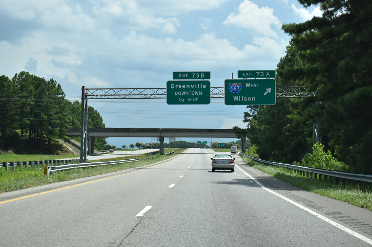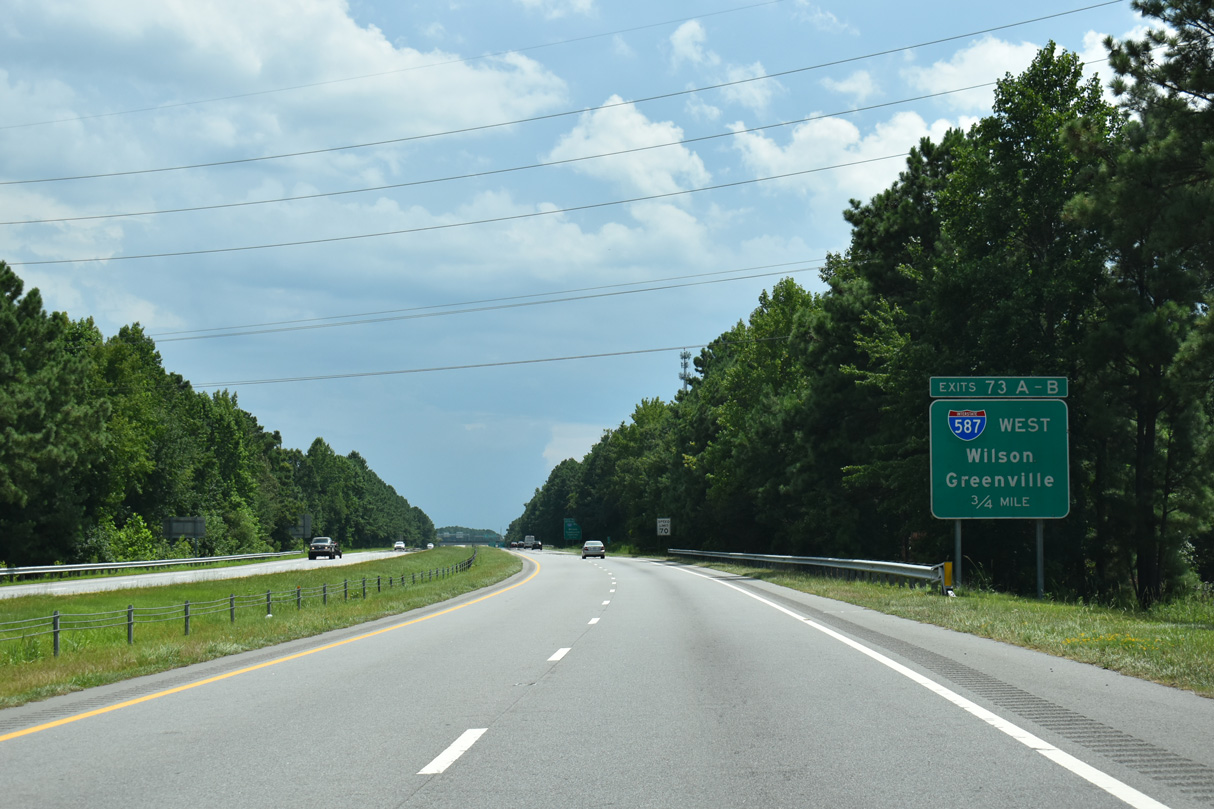 Interstate 587 replaced U.S. 264 along the freeway east from I-95 outside Wilson to U.S. 264/NC 11 Bypass along the west side of Greenville. I-795 overlaps with I-587 southeast between I-95 and its continuation south to Goldsboro. Future I-587 will overlay the remainder of the freeway along U.S. 264 west from I-95/795 outside Wilson to U.S. 64 (Future I-87) at Zebulon.