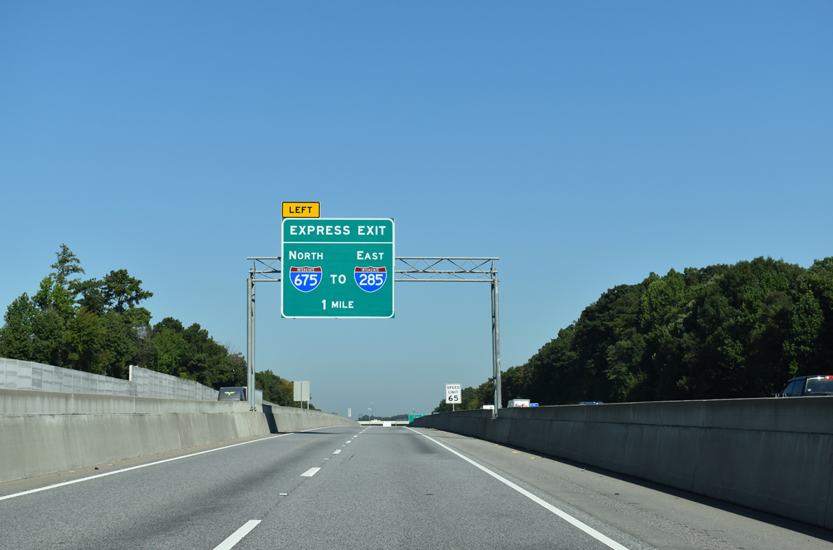 Traffic from I-675 north separates for I-285 west and U.S. 23/SR 42