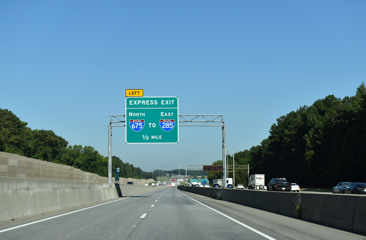 Completed in January 2017, the reversible I-75 South Metro Express Lanes accompany Interstate 75 northward to the suburban route of I-675. 09/22/22