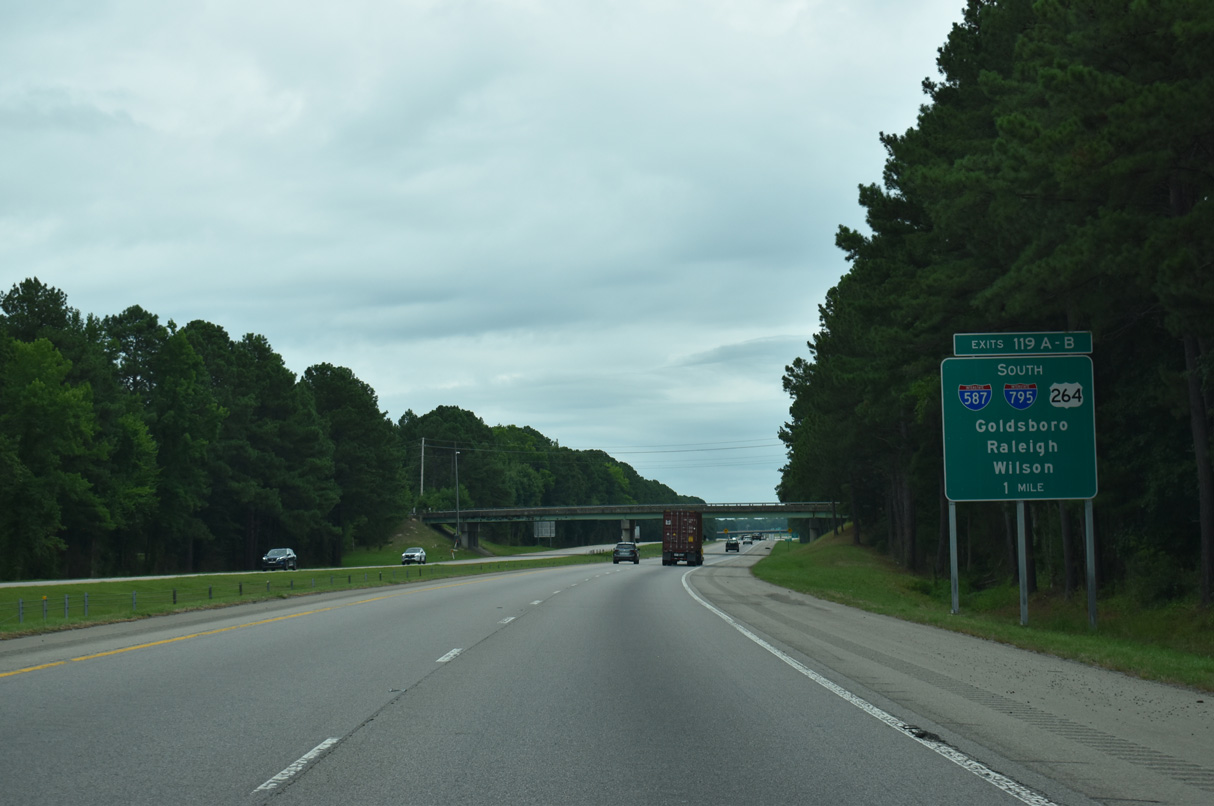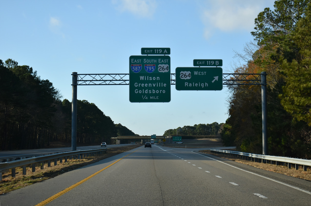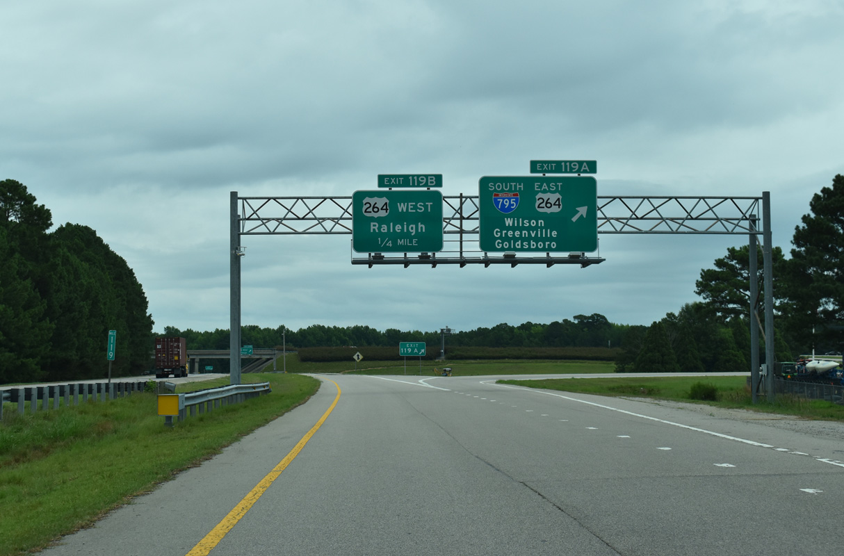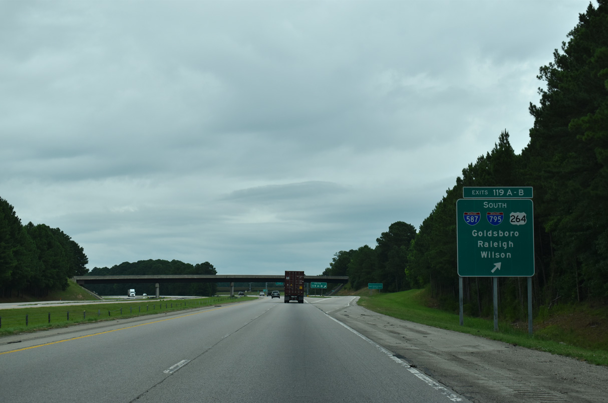 Interstate 795 branches southeast from I-95 at Exit 119 and accompanies I-587 and U.S. 264 along the southwestern outskirts of Wilson. I-795 and I-587/U.S. 264 separate at a wye interchange south of Wiggins Mill Reservoir. I-587/U.S. 264 continue east to Greenville while I-795 turns south along a rural freeway to the towns of Fremont and Pikeville.