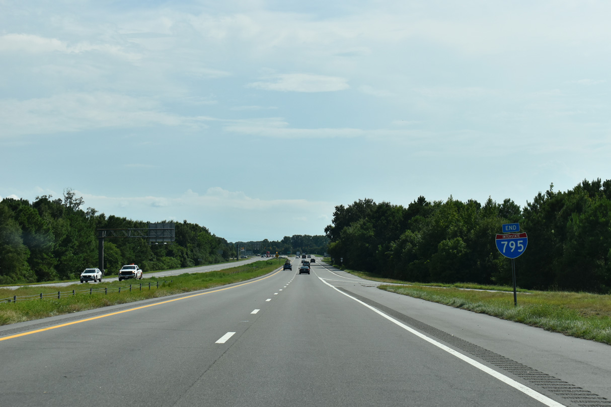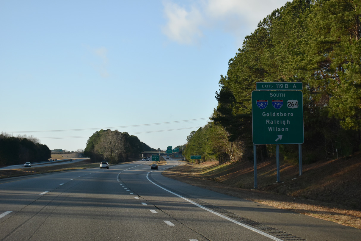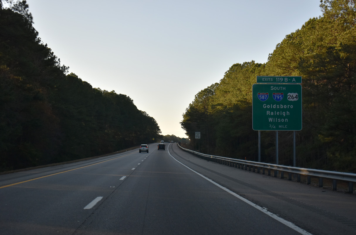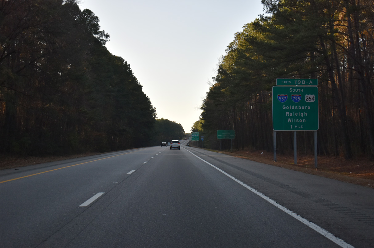 Interstate 795 branches southeast from I-95 at Exit 119 and accompanies I-587 and U.S. 264 along the southwestern outskirts of Wilson. I-795 and I-587/U.S. 264 separate at a wye interchange south of Wiggins Mill Reservoir. I-587/U.S. 264 continue east to Greenville while I-795 turns south along a rural freeway to the towns of Fremont and Pikeville.